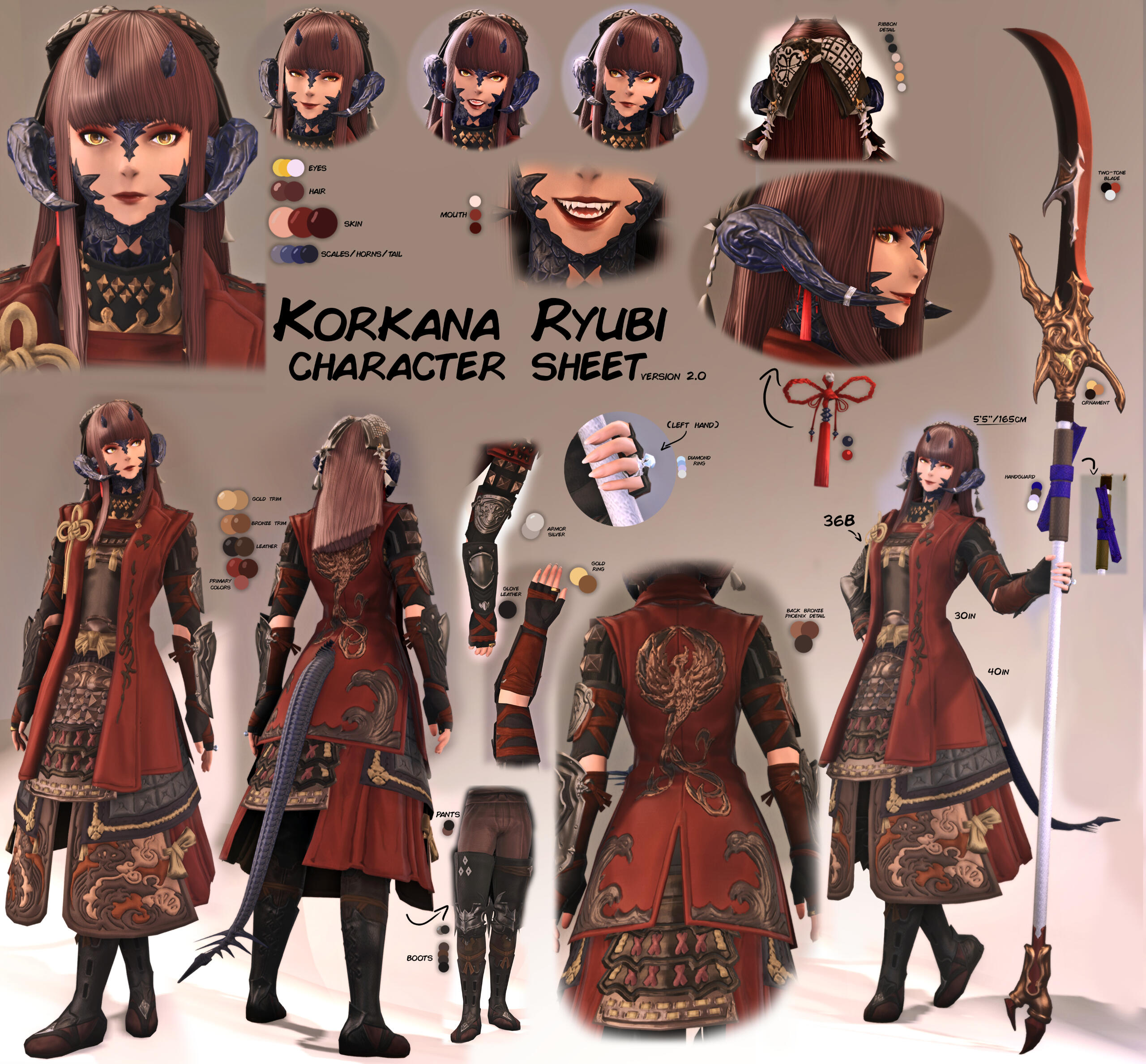 Korkana is valiant and brave, but cocky. She believes that the spear is the ultimate weapon, loves taking on challengers in a fight, and loves to spar. Her mother, Matron Korah Kharaga, was considered to be the best fighter in all of the Steppe until Sadu appeared. These genes were passed to Korkana, who is never one to back down from the fight. She is the very embodiment of the Xaela Fighting Spirit. She loves food from outside the Steppe, spending time in hot baths in Doma or Yanxia, and playing games with friends. She also loves alcohol, but is not well-versed in it to have built up any good tolerance to it, and finds herself drunk quickly. With friends, she's an Older Sister type, caring and nurturing, willing to lend a hand, ear, or shoulder to those in need.